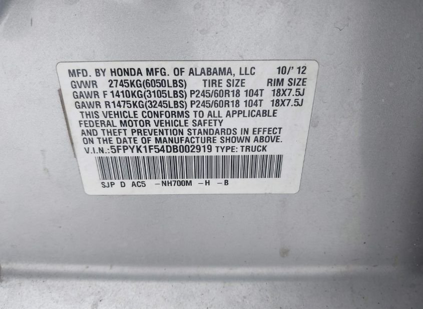 - VIN: 5FPYK1F54DB002919