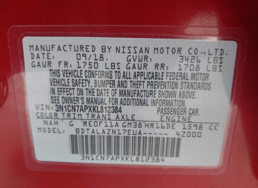 - VIN: 3N1CN7APXKL812384