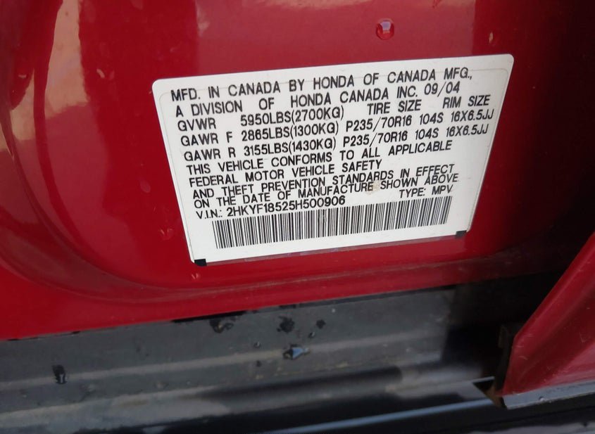 - VIN: 2HKYF18525H500906
