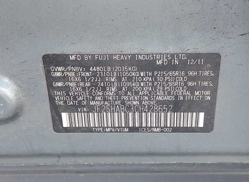 - VIN: JF2SHABC3CH428652