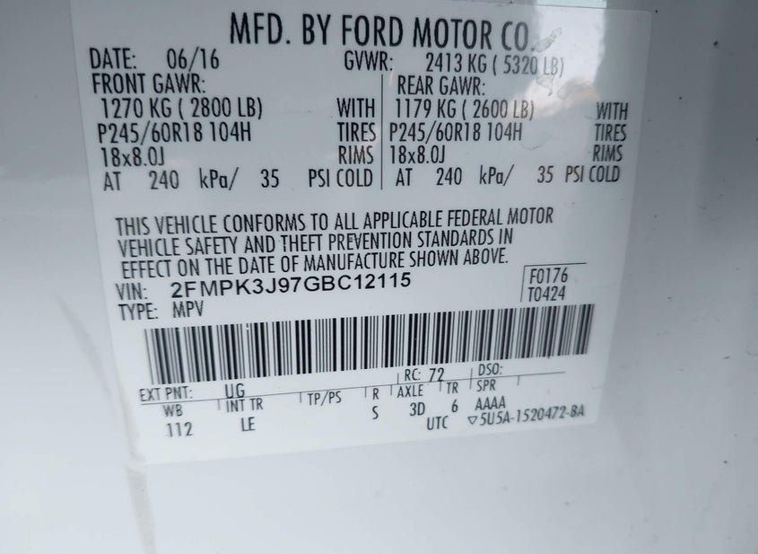 - VIN: 2FMPK3J97GBC12115