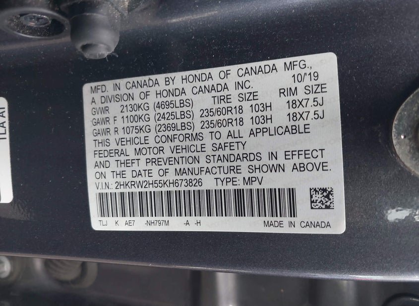 - VIN: 2HKRW2H55KH673826