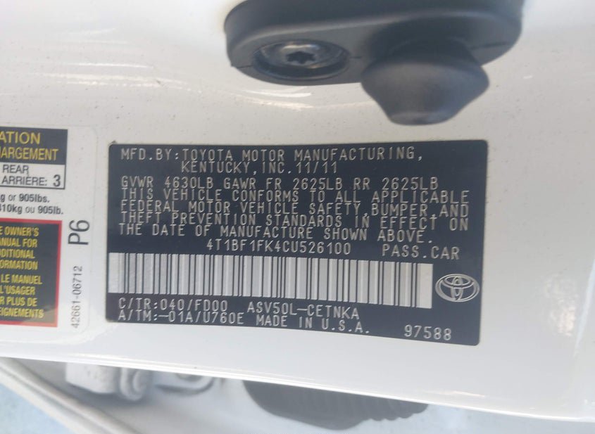 - VIN: 4T1BF1FK4CU526100