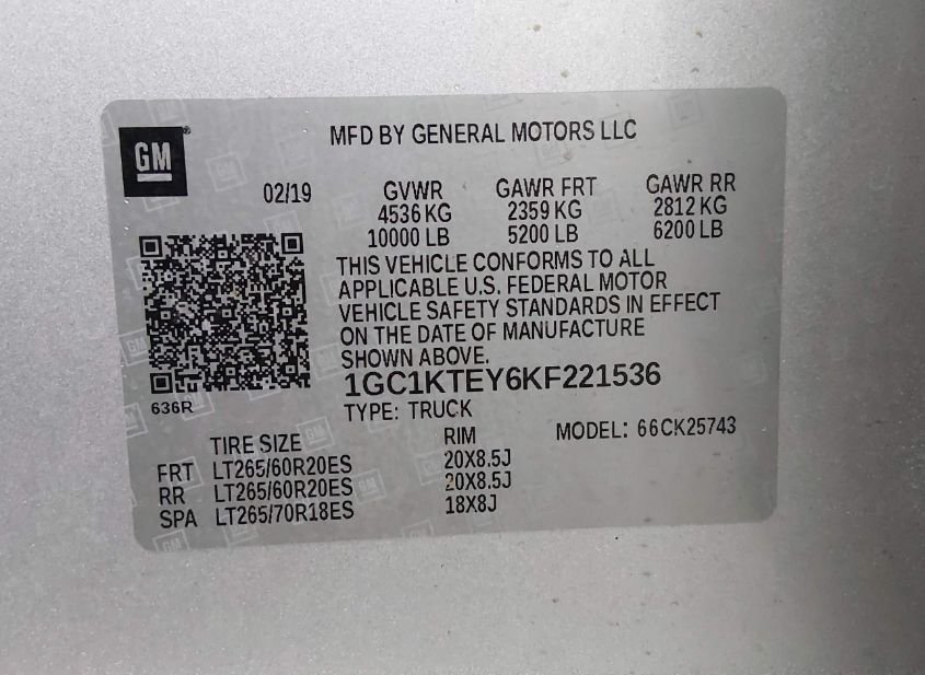 - VIN: 1GC1KTEY6KF221536