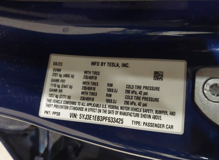 - VIN: 5YJ3E1EB3PF633425