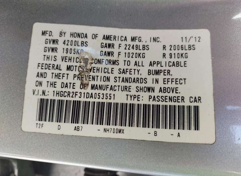 - VIN: 1HGCR2F31DA053551