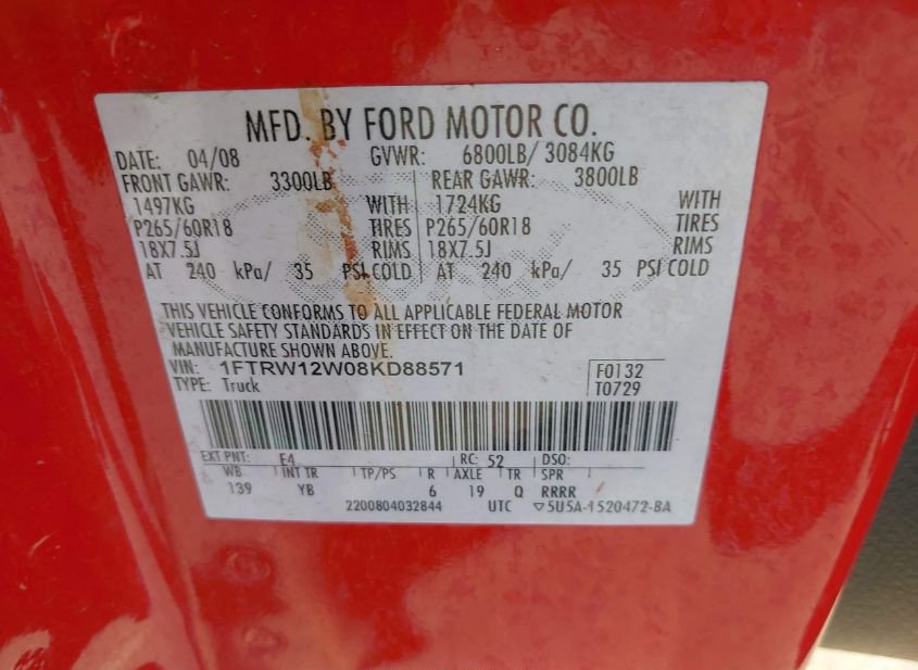 - VIN: 1FTRW12W08KD88571