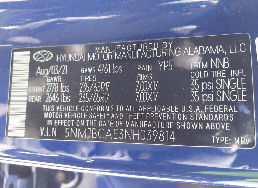 - VIN: 5NMJBCAE3NH039814