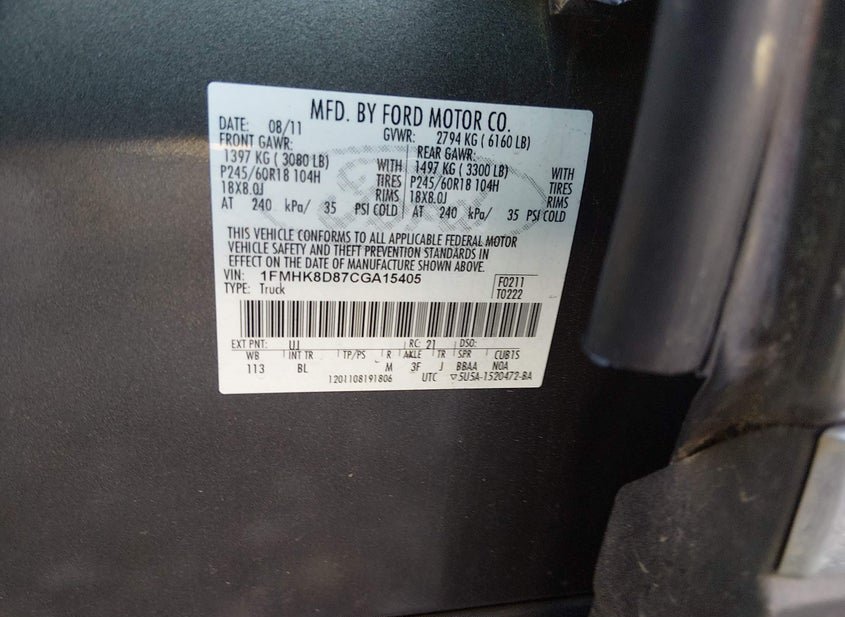 - VIN: 1FMHK8D87CGA15405