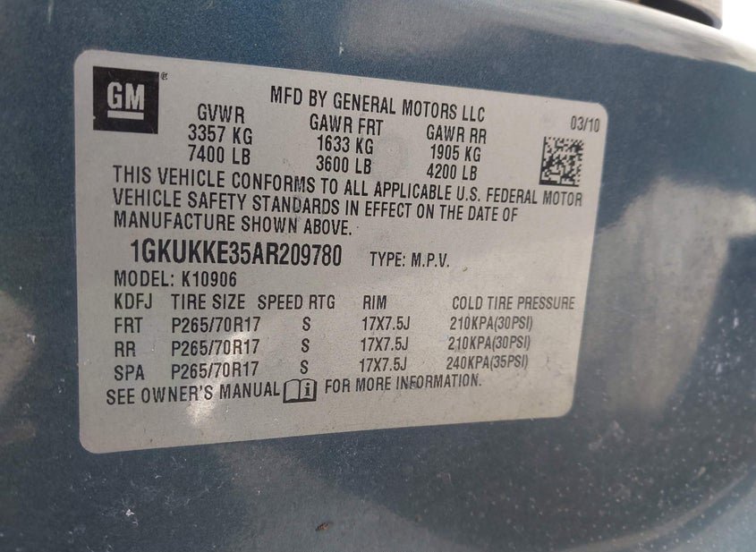 - VIN: 1GKUKKE35AR209780