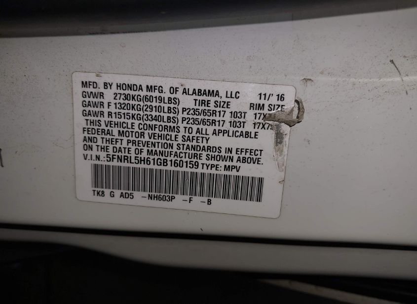 - VIN: 5FNRL5H61GB160159