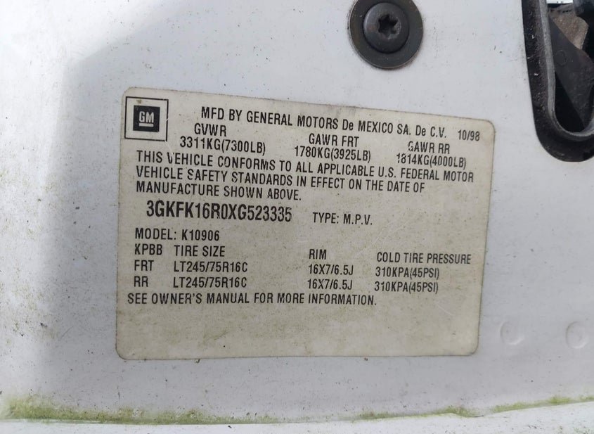 - VIN: 3GKFK16R0XG523335