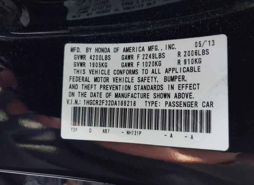 - VIN: 1HGCR2F32DA189218