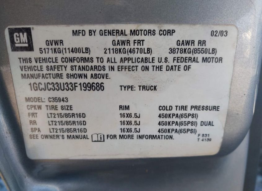 - VIN: 1GCJC33U33F199686