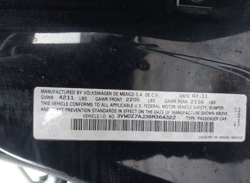 - VIN: 3VWDZ7AJ3BM364322
