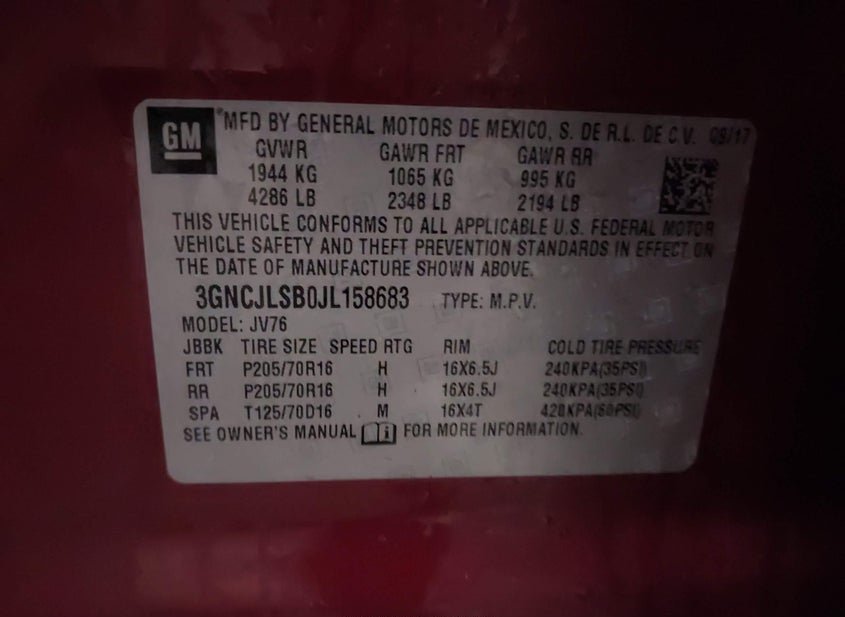 - VIN: 3GNCJLSB0JL158683