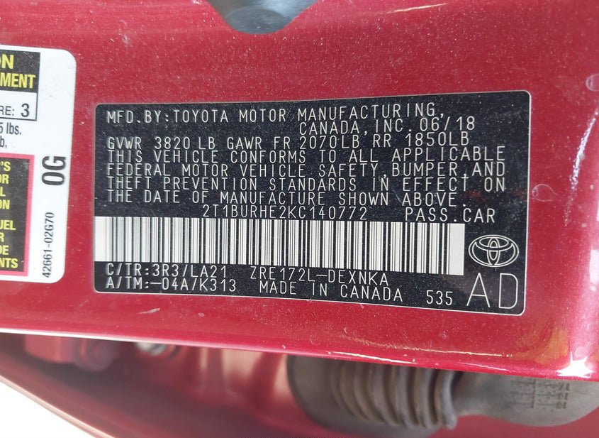 - VIN: 2T1BURHE2KC140772