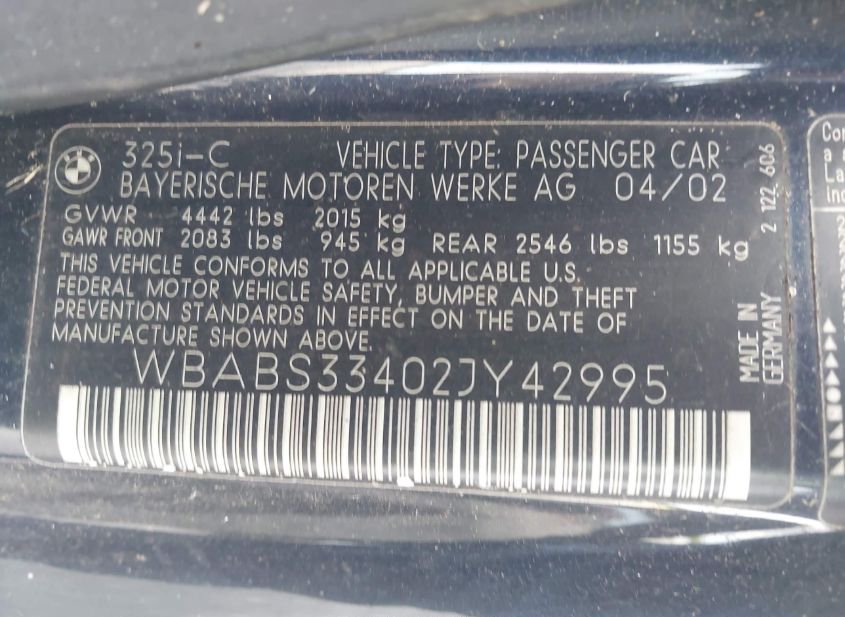 - Название лота: 2002 BMW 325CI