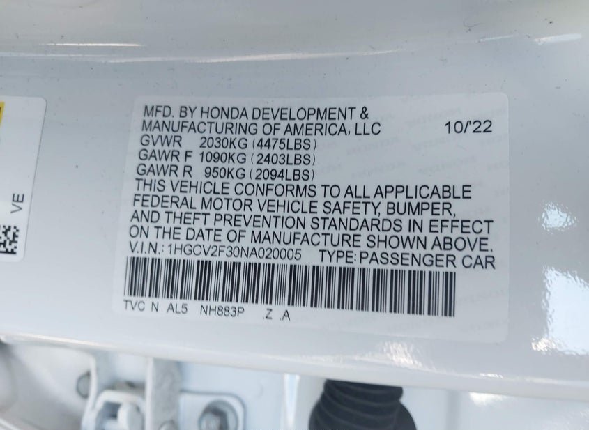 - VIN: 1HGCV2F30NA020005