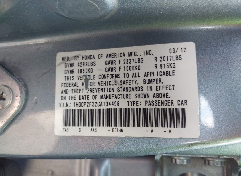 - VIN: 1HGCP2F32CA134496