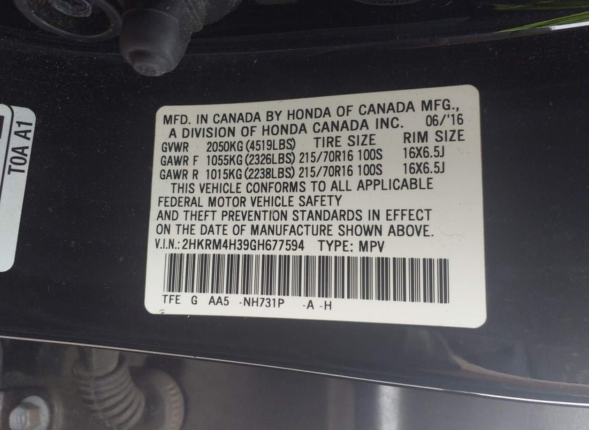 - VIN: 2HKRM4H39GH677594