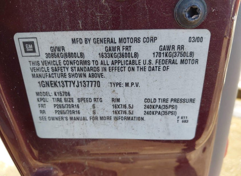 - VIN: 1GNEK13T7YJ137770