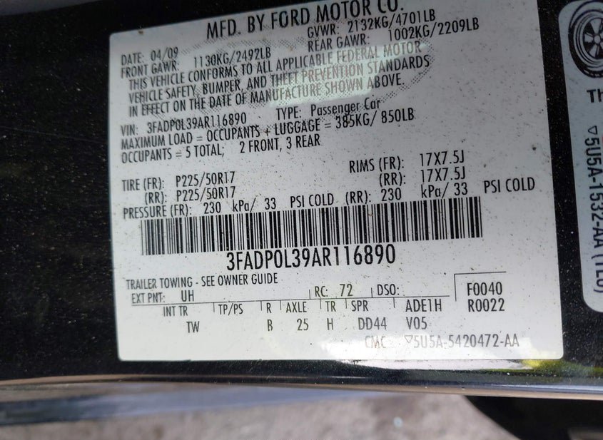 - VIN: 3FADP0L39AR116890