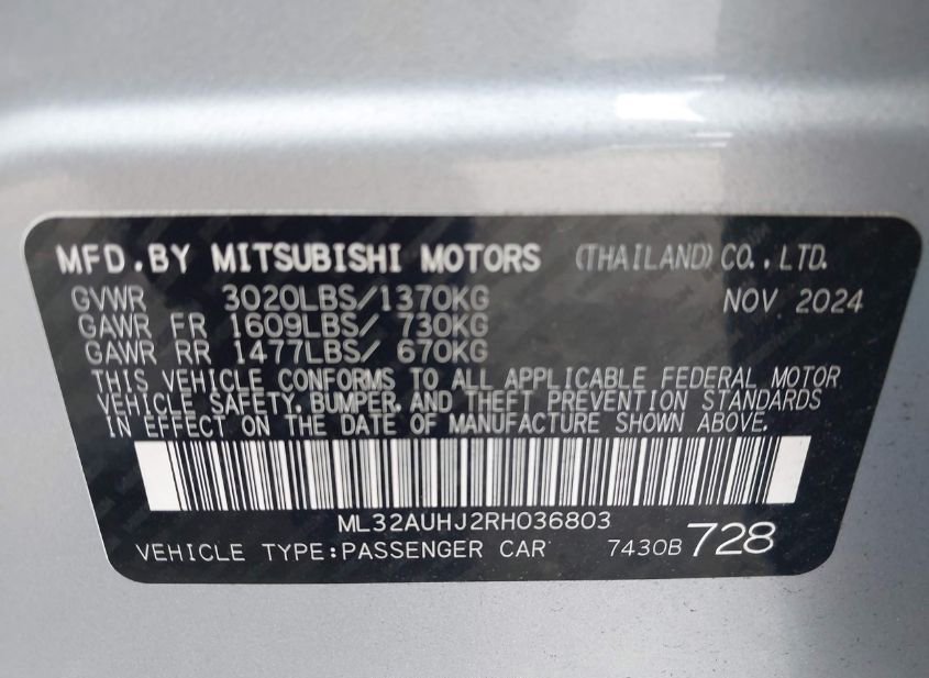 - Название лота: 2024 MITSUBISHI MIRAGE ES