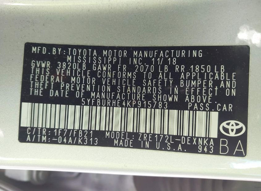 - VIN: 5YFBURHE4KP915783