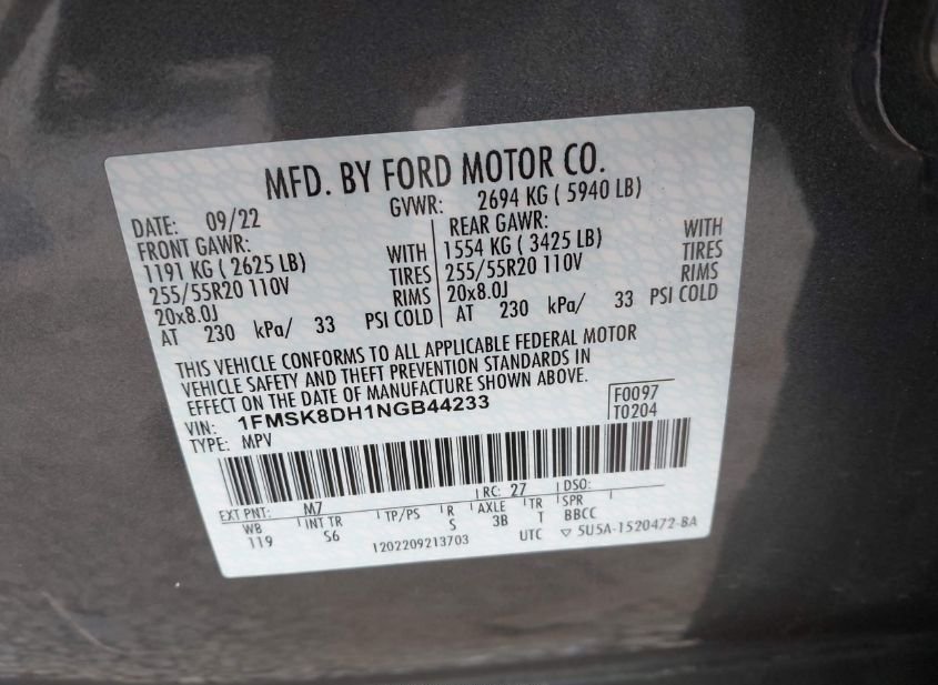 - VIN: 1FMSK8DH1NGB44233