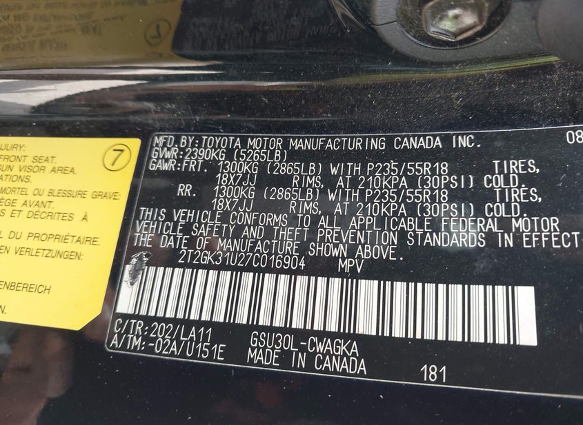- VIN: 2T2GK31U27C016904