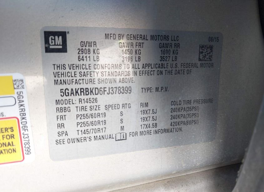 - VIN: 5GAKRBKD6FJ378399