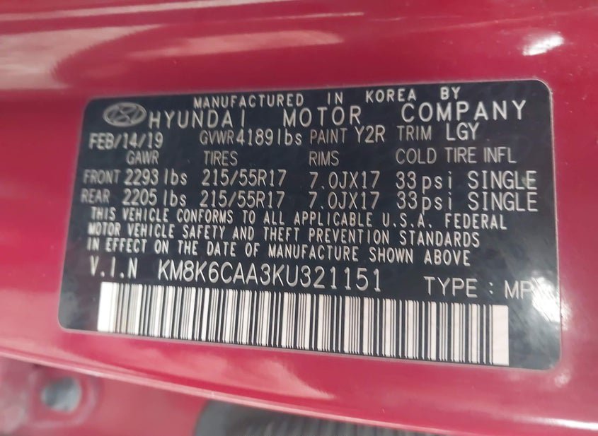 - VIN: KM8K6CAA3KU321151