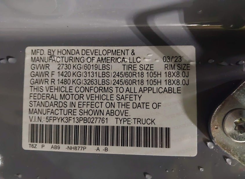 - VIN: 5FPYK3F13PB027761