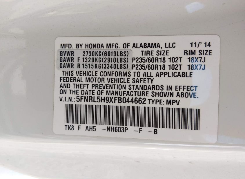 - VIN: 5FNRL5H9XFB044662