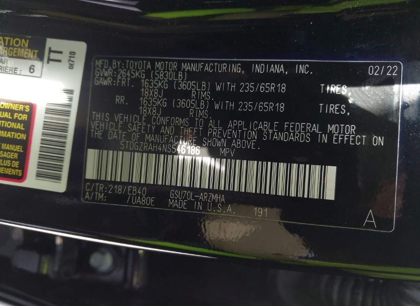 - VIN: 5TDGZRAH4NS546186