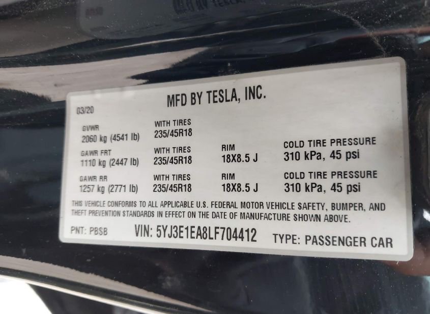 - VIN: 5YJ3E1EA8LF704412