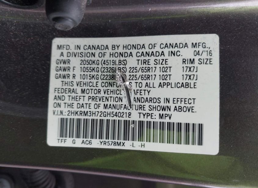 - VIN: 2HKRM3H72GH540218