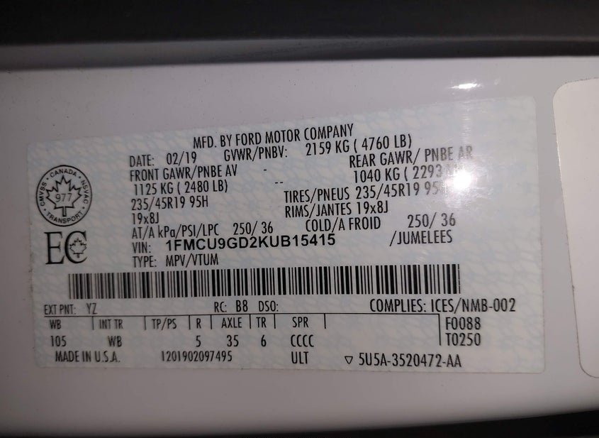 VIN: 1FMCU9GD2KUB15415 · Byron Center, MI, 49315 · MI Clear