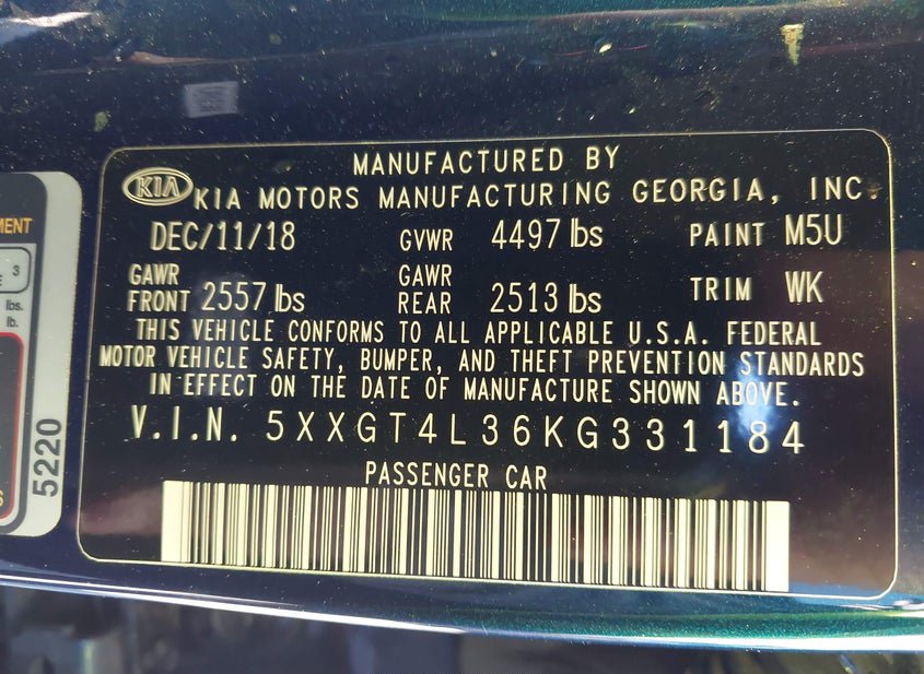 VIN: 5XXGT4L36KG331184 · Winder, GA, 30680 · GA Salvage