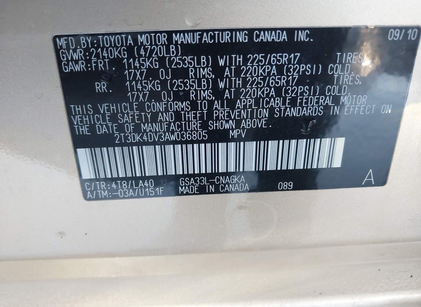 VIN: 2T3DK4DV3AW036805 · BALTIMORE, MD, 21226 · MD SALVAGE - 75% OR LESS