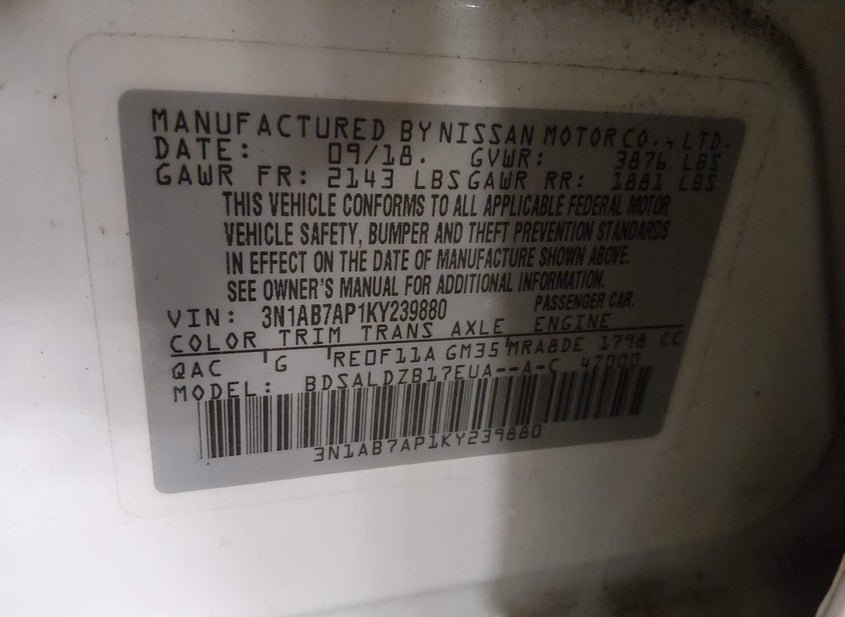 VIN: 3N1AB7AP1KY239880 · SPRINGFIELD, NE, 68059 · NE SALVAGE