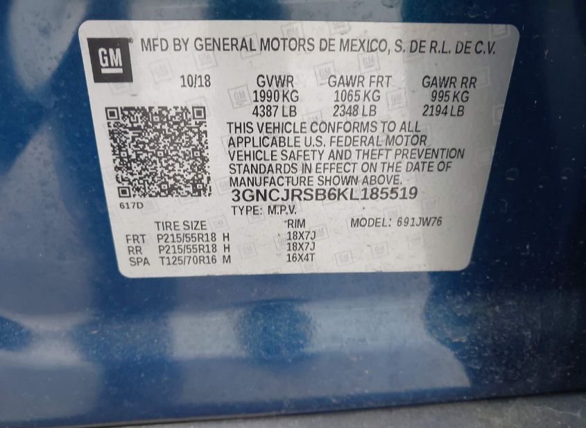 VIN: 3GNCJRSB6KL185519 · Crothersville, IN, 47229 · IN Salvage