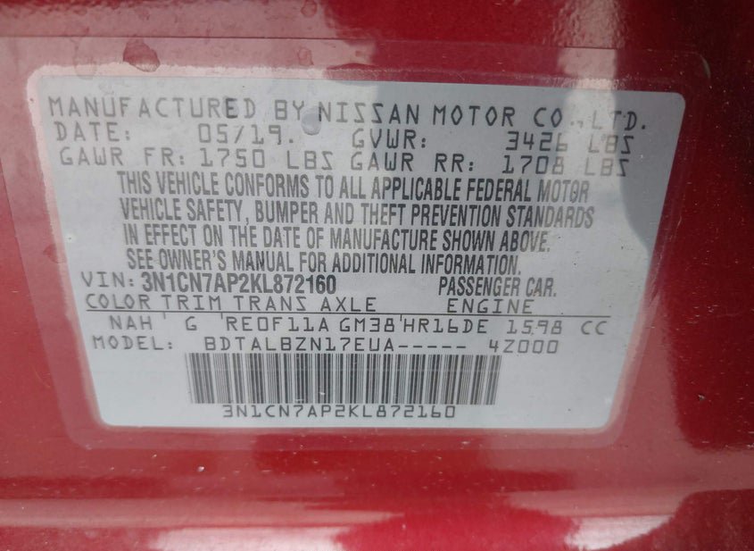VIN: 3N1CN7AP2KL872160 · HOUSTON, TX, 77032 · TX SALVAGE