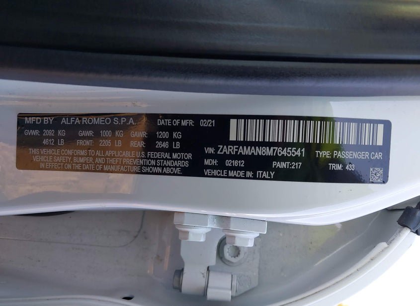 VIN: ZARFAMAN8M7645541 · Medford, NY, 11763 · NY Mv-907A