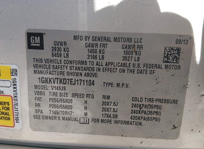 VIN: 1GKKVTKD7EJ171104 · Grenada, MS, 38901 · MS Salvage