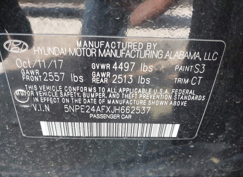 VIN: 5NPE24AFXJH662537 · HOUSTON, TX, 77032 · TX ORIGINAL APPLIED WITH ODO OWNER ATTESTED TO.