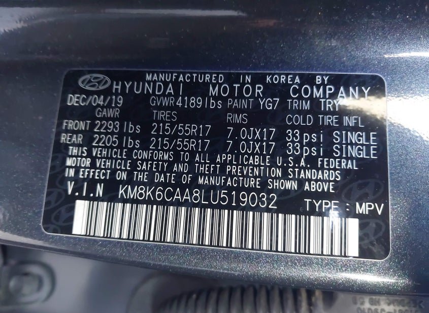 VIN: KM8K6CAA8LU519032 · Lorain, OH, 44053 · OH Salvage