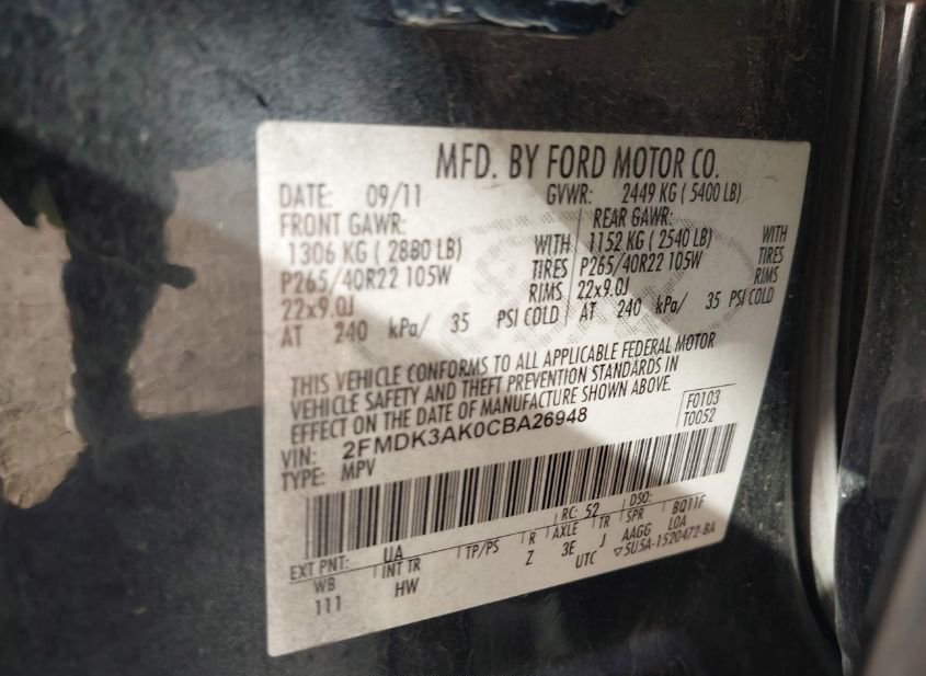 VIN: 2FMDK3AK0CBA26948 · SAN ANTONIO, TX, 78224 · TX ORIGINAL 180000 NOT ACTUAL MILES