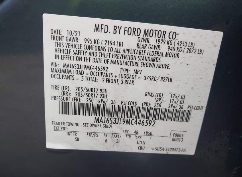 VIN: MAJ6S3JL9MC446592 · BELLEVILLE, MI, 48111 · MI SALVAGE 41316 TITLE MILES/41315 ODO MILES